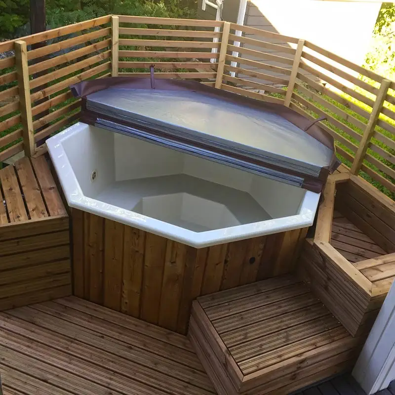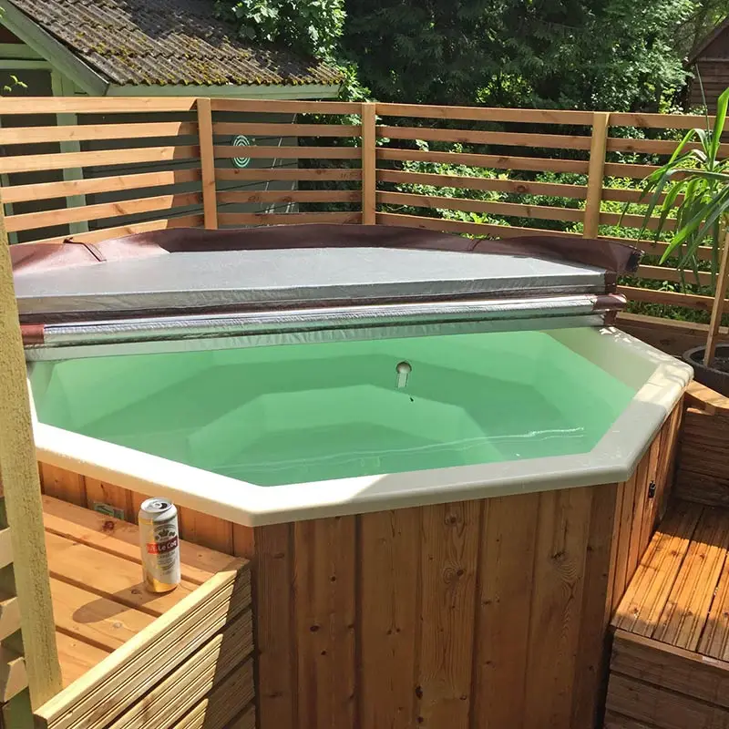 Die achteckige Badetonne ist eine stilvolle, versiegelte Konstruktion aus Thermoholz und mit GFK-Einsatz, die in 5 Farben, einschließlich Perlmutt erhältlich ist.
