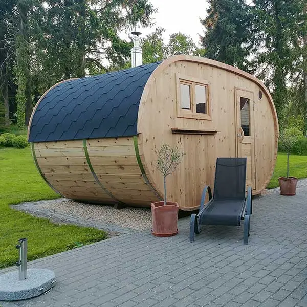 Dieses Fasssauna Oval ist aus unbehandeltem Fichtenholz gefertigt und hat eine Wandstärke von 42 mm. Mit einem guten Schutz wird dieses Holz jahrelang halten. Das Saunafass Oval hat eine Tür mit einer Höhe von 185 Zentimetern und verfügt über verglaste Fenster. Die runde Form vom Saunafass Oval sorgt für einen natürlichen Wasserabfluss, so dass keine Dachrinne oder ein spezieller Ablauf installiert werden müssen.