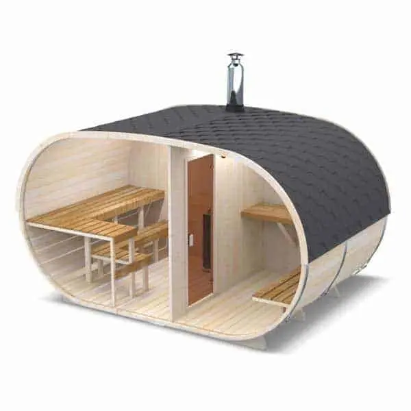 Die Fasssauna Oval ist ein hervorragendes Beispiel für eine Kombination aus Design, Funktionalität und durchdacht bis ins kleinste Detail. Dieses Fasssauna Oval-Modell verfügt über einen geräumigen Saunaraum mit Bänken auf zwei Ebenen, sodass jeder ein angenehmes Temperaturregime persönlich wählen kann. Aufgrund der Fenster an der Vorderseite gibt es viel natürliches Licht im Saunaraum. Im Inneren des Saunafass Oval gibt es eine geräumige Umkleidekabine mit einem Tisch und einer Bank, in der Sie sich nach dem Besuch der Sauna bequem umziehen oder bei schlechtem Wetter entspannen können. Damit können Sie den Saunabesuch so angenehm wie möglich gestalten