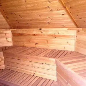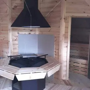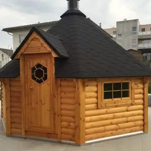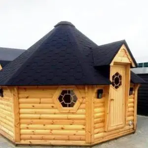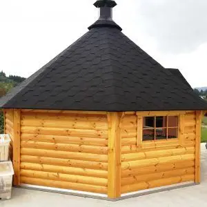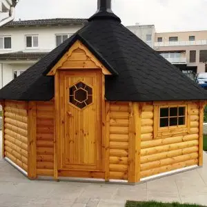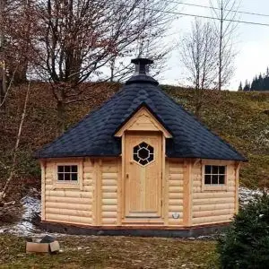 Holen Sie sich das skandinavische Wellnessgefühl nach Hause. Diese Sauna Kota  mit Grillraum lässt sich optimal im eigenen Garten oder Hof unterbringen. Aufgrund ihrer besonderen Form bietet die Sauna Kota mit Grillraum viel Platz im Innenraum und ermöglicht ein gleichzeitige grillen und saunieren.