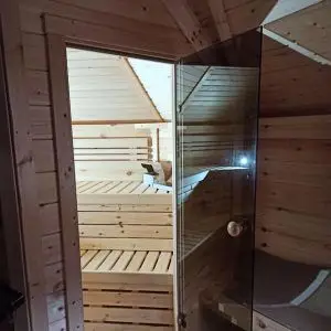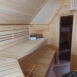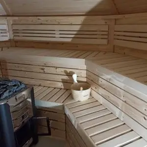 Die Sauna Kota mit Grillraum besteht aus 2 Räumen und hat einen großzügigen Innenraum. Diese Kota kann mit einem Holzofen Harvia Pro 20 ausgestattet werden, welcher die Sauna in ca. 1,5 Stunde erhitzt. Die Sauna Kota ist nur als Bausatz erhältlich und wird aus Fichte hergestellt.