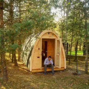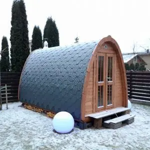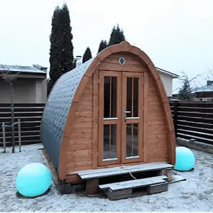 Den Sauna Pod mit Vorraum gibt es in einer Größe von 2,4m und einer Länge von 3,0m bis 5,9m. Sie ist ausgelegt für 2-8 Personen und kann sowohl als Bausatz oder auch aufgebaut gekauft werden.