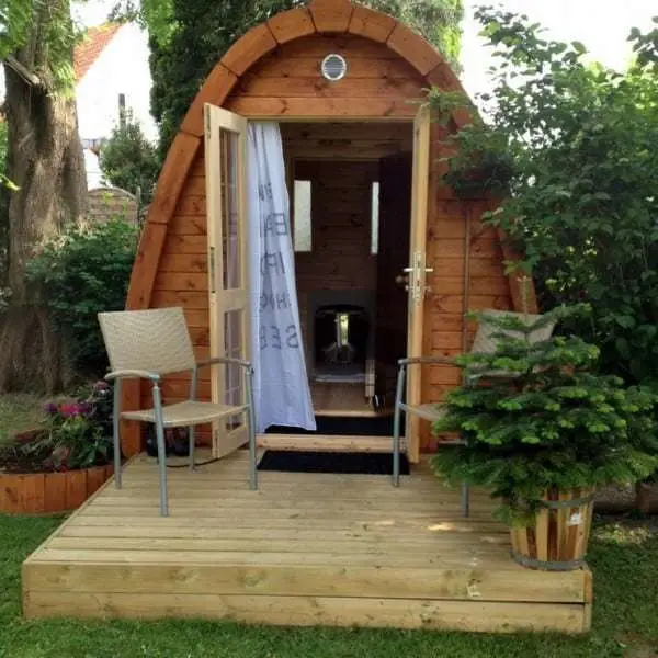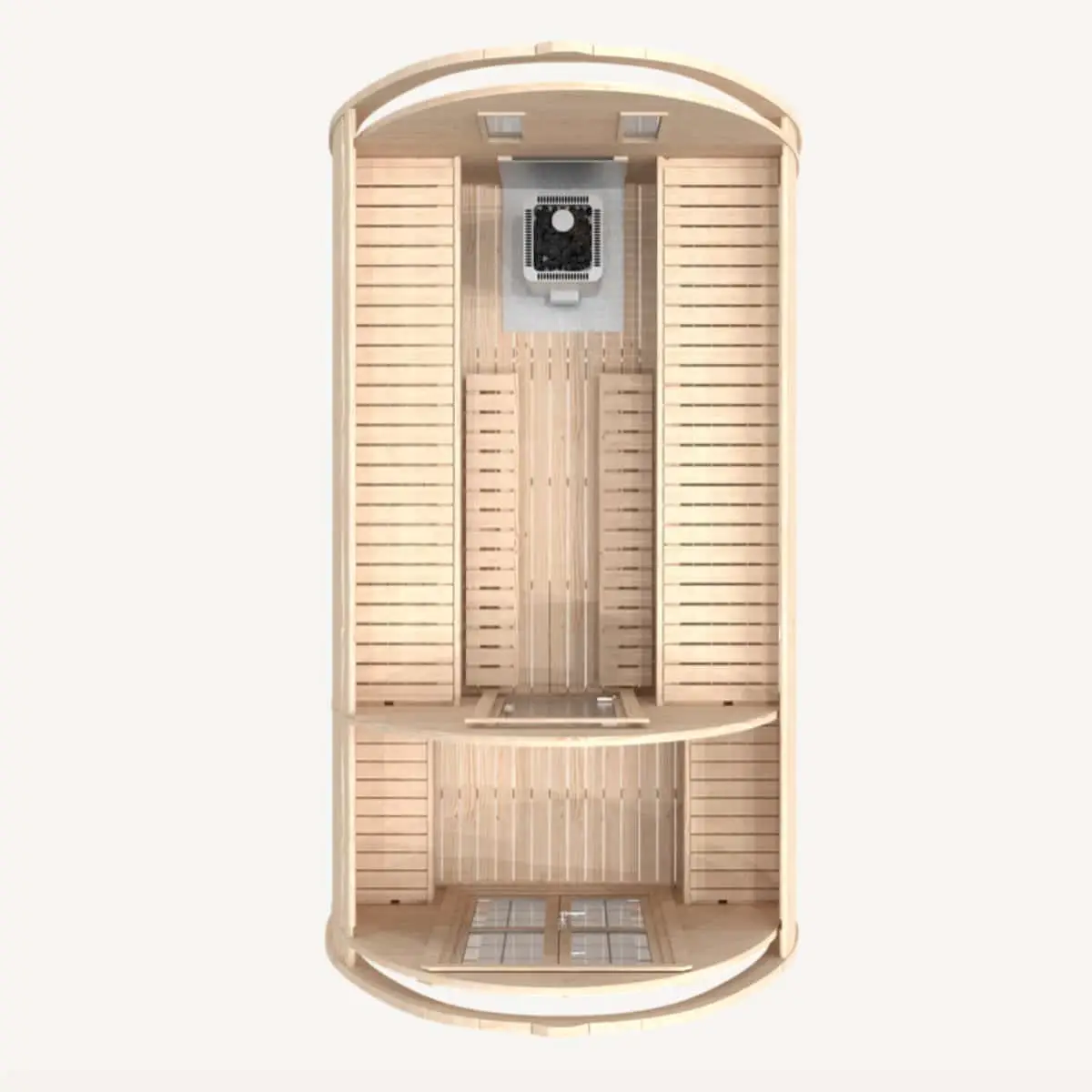 Der exklusive Sauna Pod mit Vorraum als Bauform vom Sauna Pod verschafft mehr Platz in der Sauna, behält jedoch durch das runde Dacht die positiven volumenmindernden Eigenschaften des Saunafasses.
