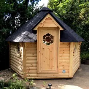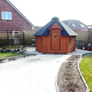 Holen Sie sich das skandinavische Wellnessgefühl nach Hause. Diese Saunakota lässt sich optimal im eigenen Garten oder Hof unterbringen. Aufgrund ihrer besonderen Form bietet sie viel Platz im Innenraum und ermöglicht ein gleichzeitige saunieren und umkleiden.