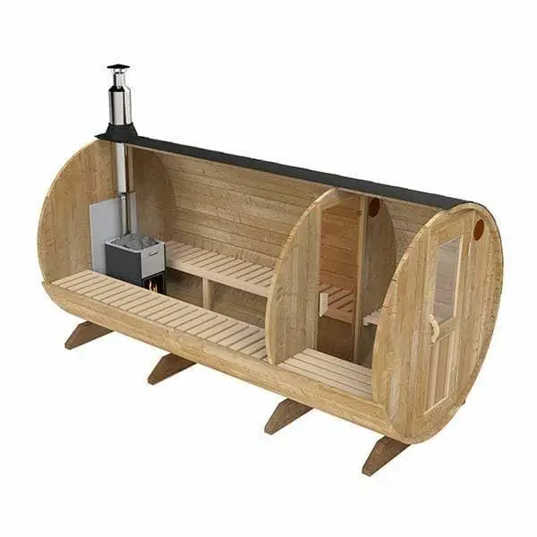 This functional and comfortable barrel sauna, consisting of two separate rooms, is an excellent option for a large family of approximately 8 to 10 people. This barrel sauna can be equipped with either a Harvia Pro 20 wood-burning stove or an electric heater. Benches are located in the changing room/anteroom. These allow you to relax after your sauna session without having to go outside. You can also store your personal belongings here. By purchasing this practical barrel sauna with an anteroom, you get comfort and wellness at an affordable price. It’s a great gift for the health of the whole family. Your barrel sauna will be even more valuable if you choose thermowood . This is particularly durable and resilient and also leaves behind a pleasant smoky aroma.